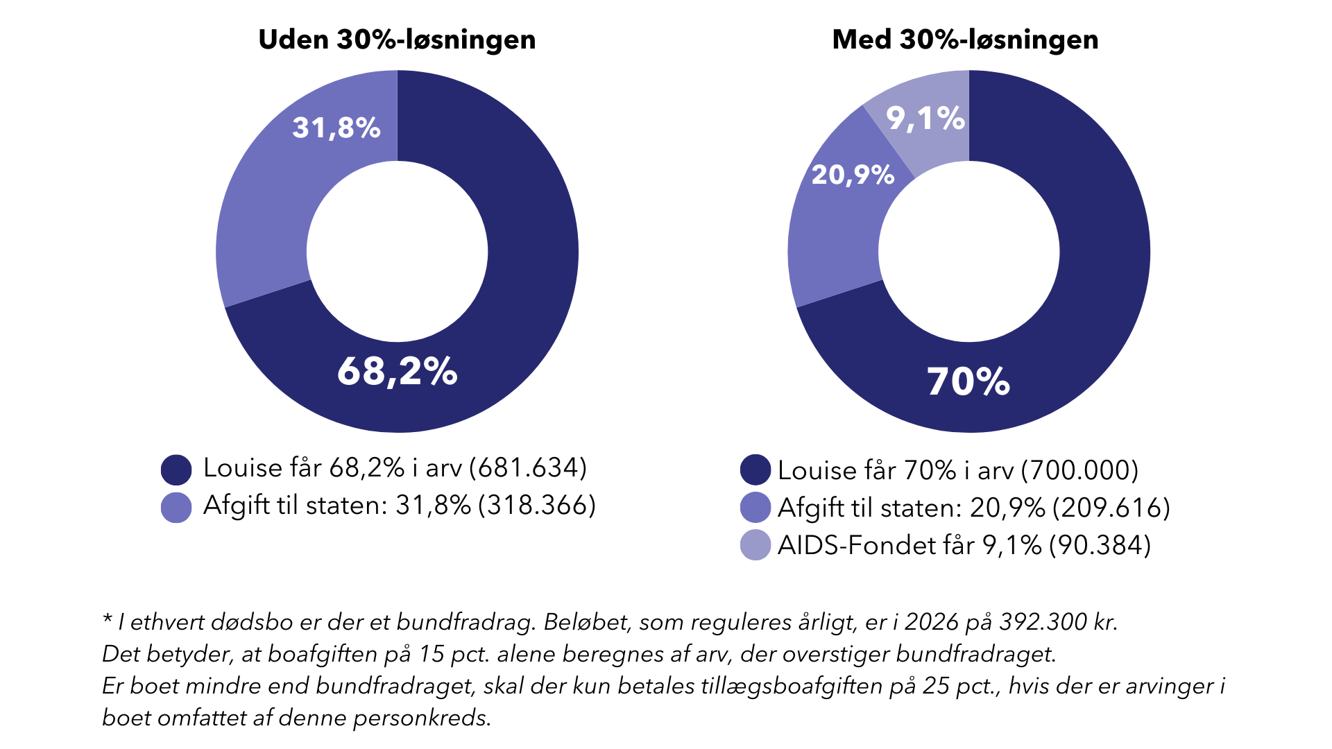 Henrik og Peter er gift, men efterlader sig ingen børn. De ønsker, at arven på 1.000.000 kr. efter dem skal gå til Henriks niece, Louise. I den forbindelse overvejer de 30%-løsningen med AIDS-Fondet som velgørende forening. Beregningerne er baseret på 2026-tal efter fradrag af bundfradrag på 392.300 kr.*